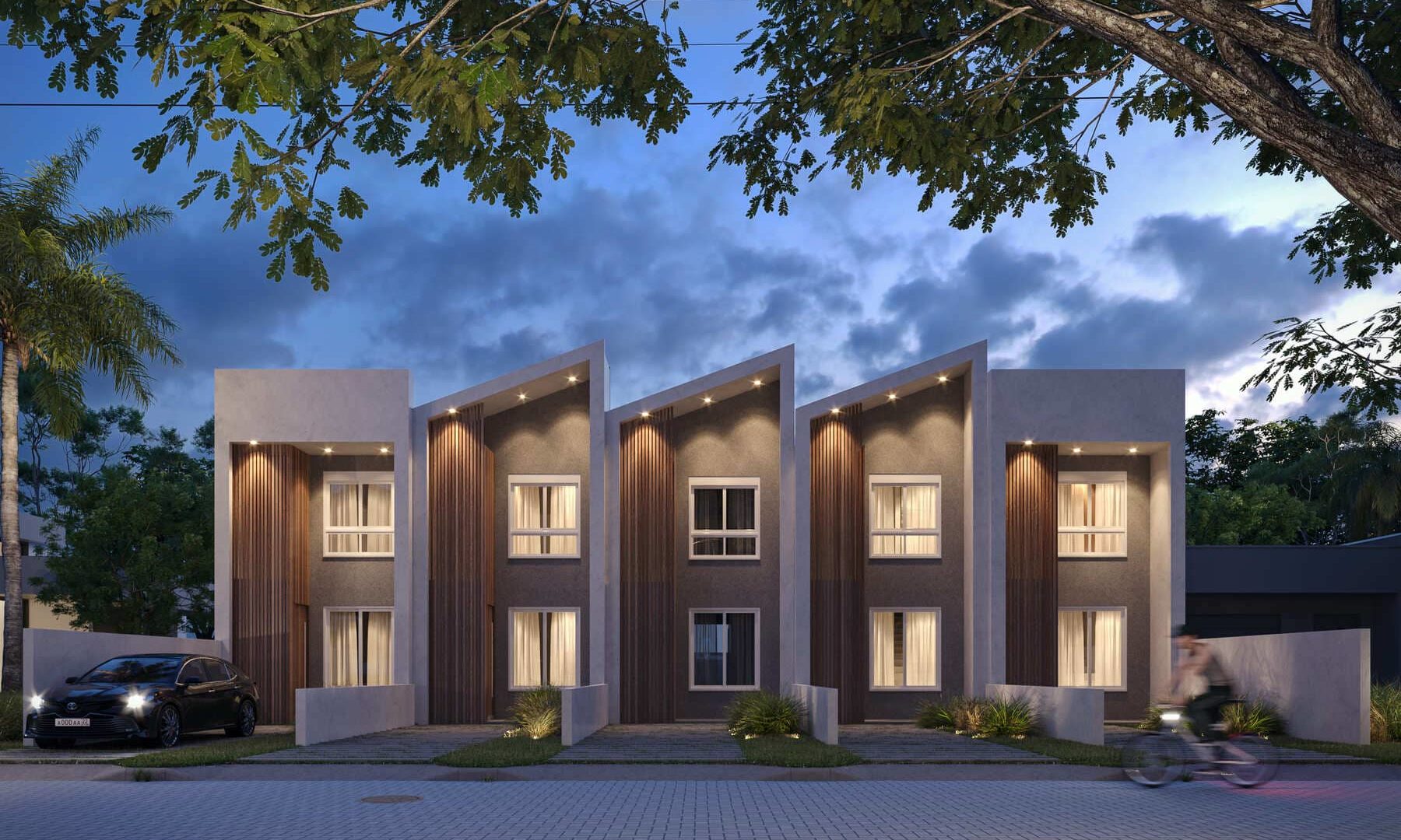Conjunto residencial multifamiliar de linhas retas e volumetria simétrica, com destaque para o uso de madeira e iluminação cênica que valoriza a fachada e reforça o caráter contemporâneo do projeto.