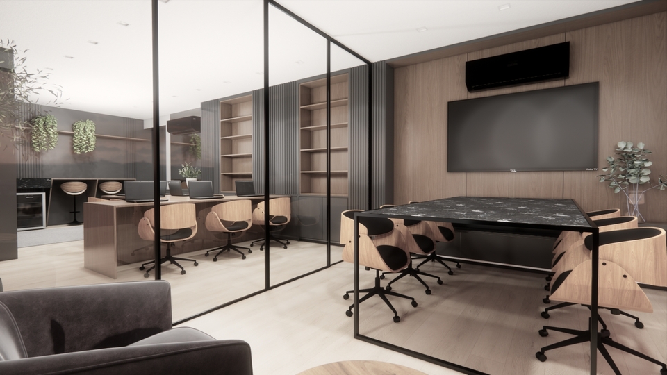 Escritório contemporâneo com layout integrado e atmosfera elegante. O projeto valoriza a iluminação natural e a vista externa, combinando madeira, preto fosco e vidro para transmitir sofisticação e funcionalidade. O mobiliário de linhas retas e tons neutros, aliado a elementos verdes pontuais, reforça a sensação de equilíbrio e bem-estar no ambiente corporativo.