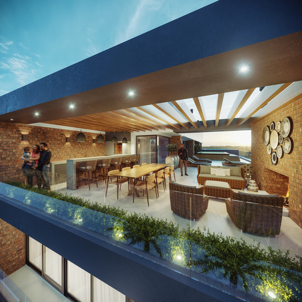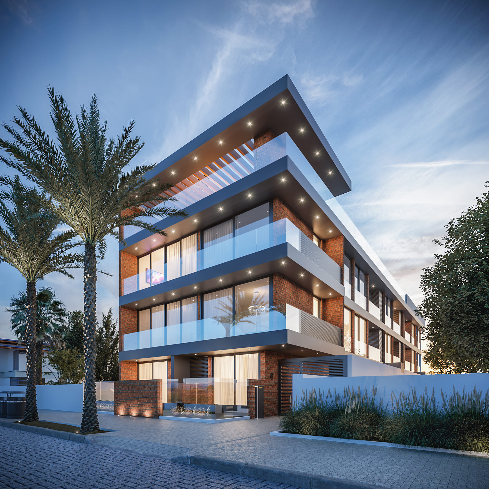 Residencial multifamiliar contemporâneo, com volumes marcados e balanços lineares que valorizam o ritmo horizontal da fachada. O uso de vidro, tijolo aparente e iluminação embutida confere elegância e leveza ao conjunto.